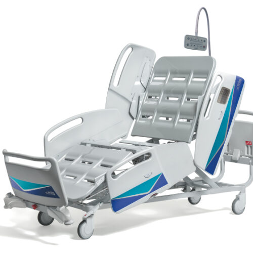 Letto elettrico a 4 sezioni, di cui 3 snodate e 1 fissa centrale. Piano di coricamento removibile realizzato in resistente ABS termoformato completo di elementi ferma materasso integrati. Schienale con retro traslazione. Testiera fissa e telaio superiore dotato di 4 sedi per l’inserimento di asta solleva malato e asta flebo. Basamento in acciaio completo di gruppo ruote a freno centralizzato. Allungaletto ad estrazione e batteria tampone integrati.