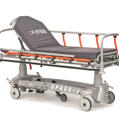 Barella ad altezza variabile su compassi. Piano paziente in laminato sp. 8 mm. a 2 sezioni. Movimentazione schienale mediante molle a gas con comando a leva bilaterale. Regolazione altezza mediante pedali bilaterali posti in zona…