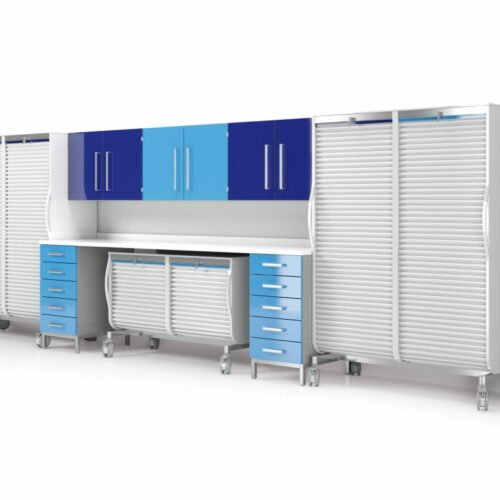 Parete tecnica attrezzata caratterizzata dall’ampia gamma di elementi che permette di configurare pareti per ogni tipologia di locale ed esigenza di reparto. Moduli porta farmaci con anta ad estrazione, porta vaschette ISO, frigo…
